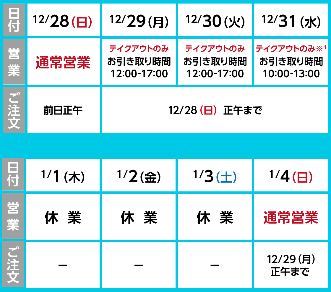 12月29日~31日までの対応メニューは下記の4種類です。